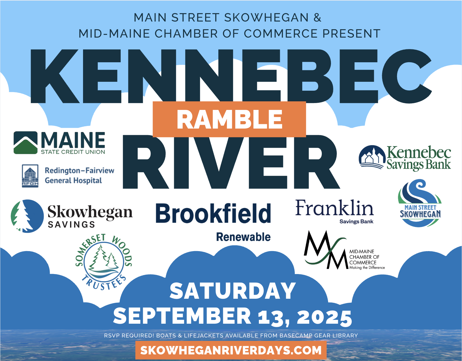 Main Street Skowhegan is excited to host our third Kennebec River Ramble event, in partnership with our friends at the Mid-Maine Chamber of Commerce. Many thanks to our lead River Ramble sponsors: Maine State Credit Union, Brookfield Renewable, and Kennebec Savings Bank; and to our 2025 River Days sponsors: Skowhegan Savings Bank, Hight Family of Dealerships, Franklin Savings Bank, and the Kennebec Valley Tourism Council